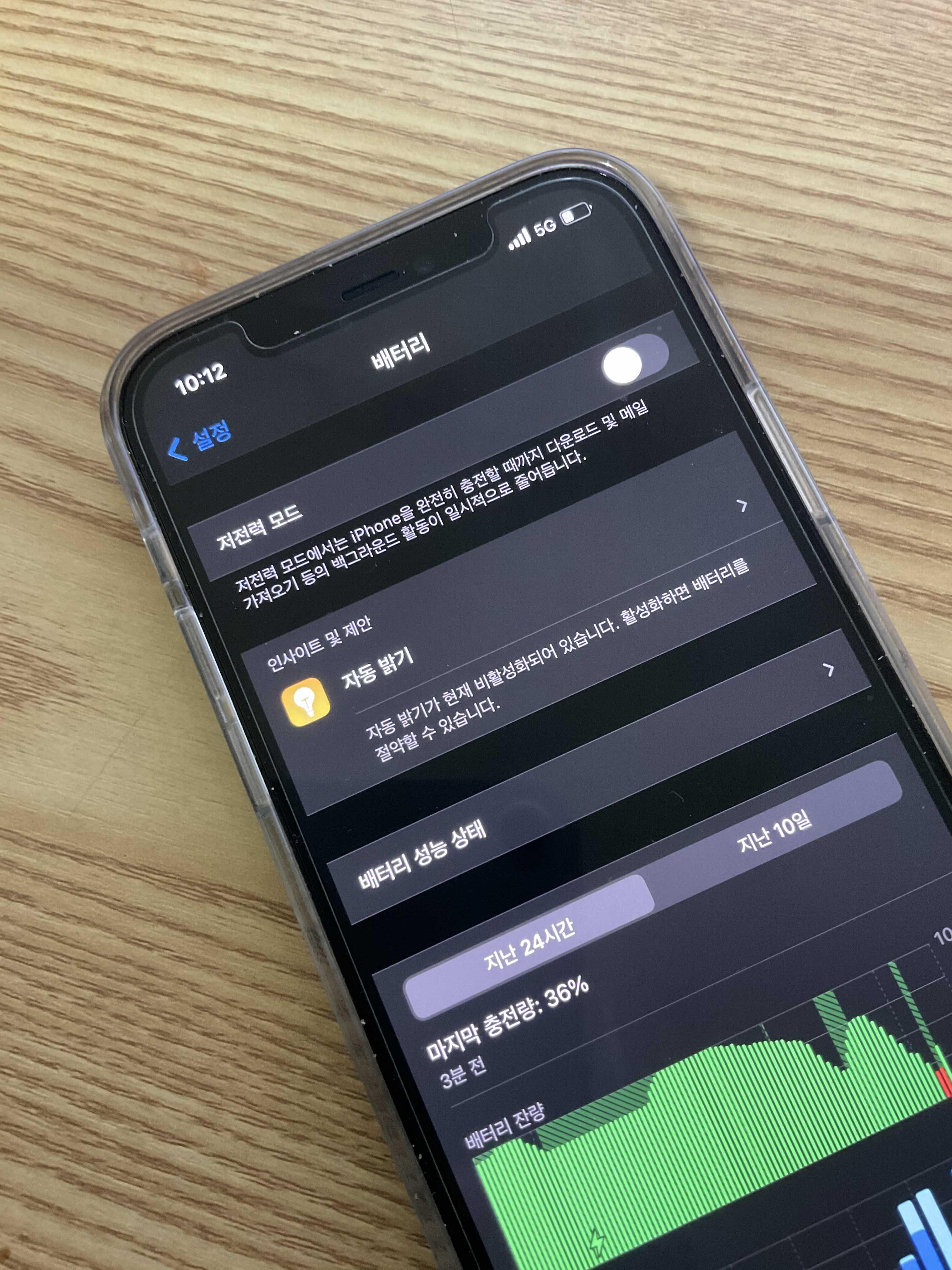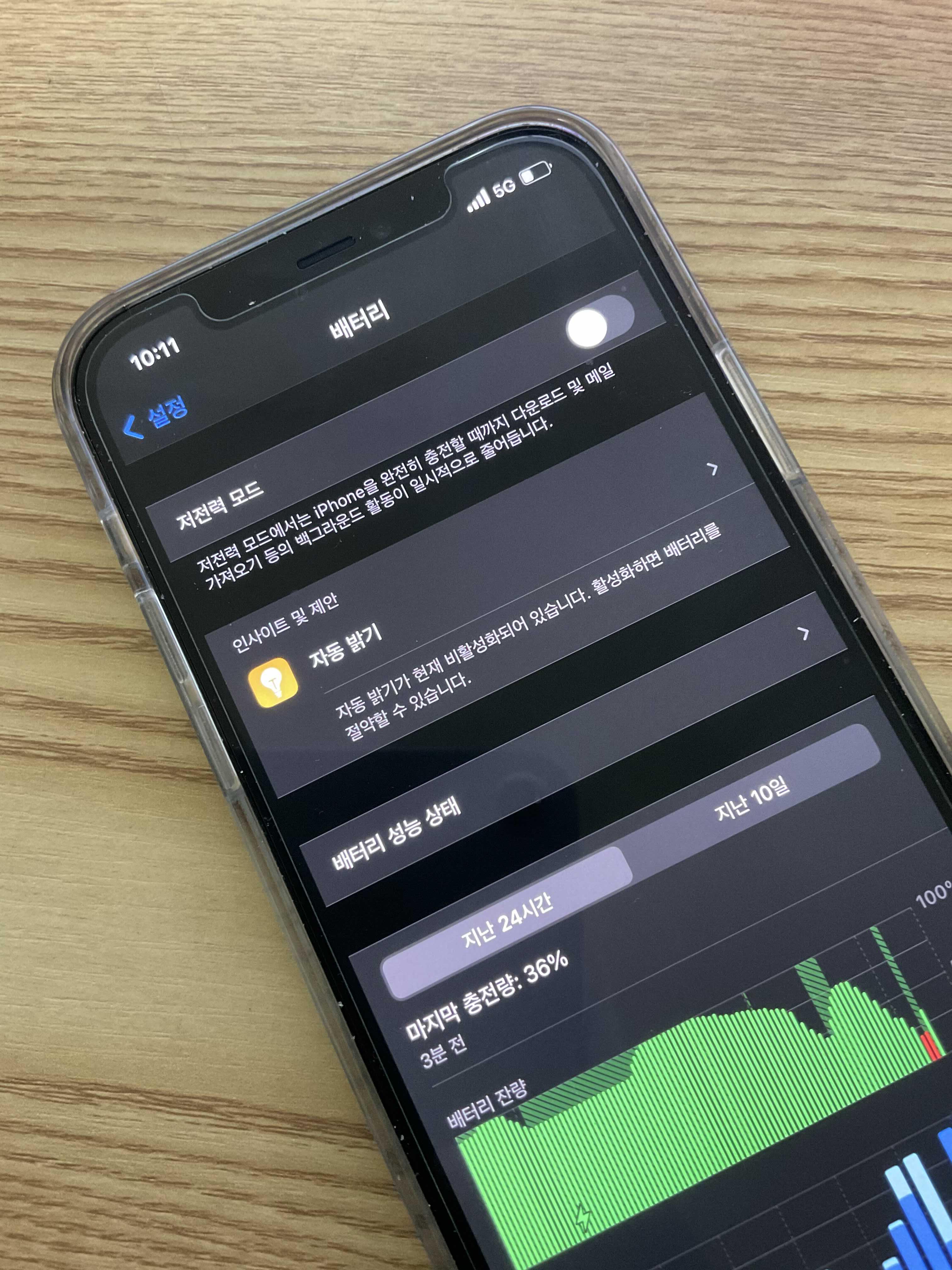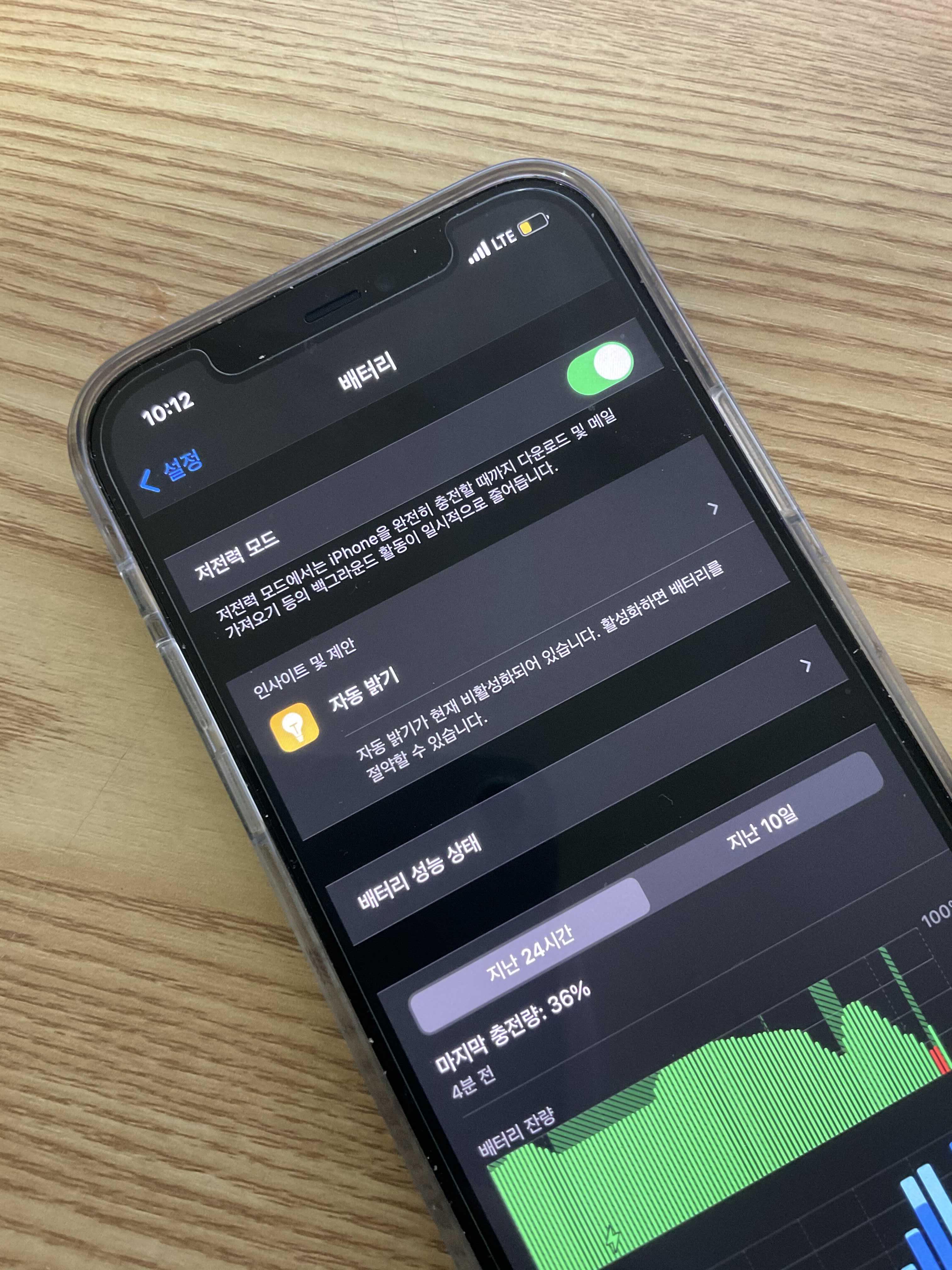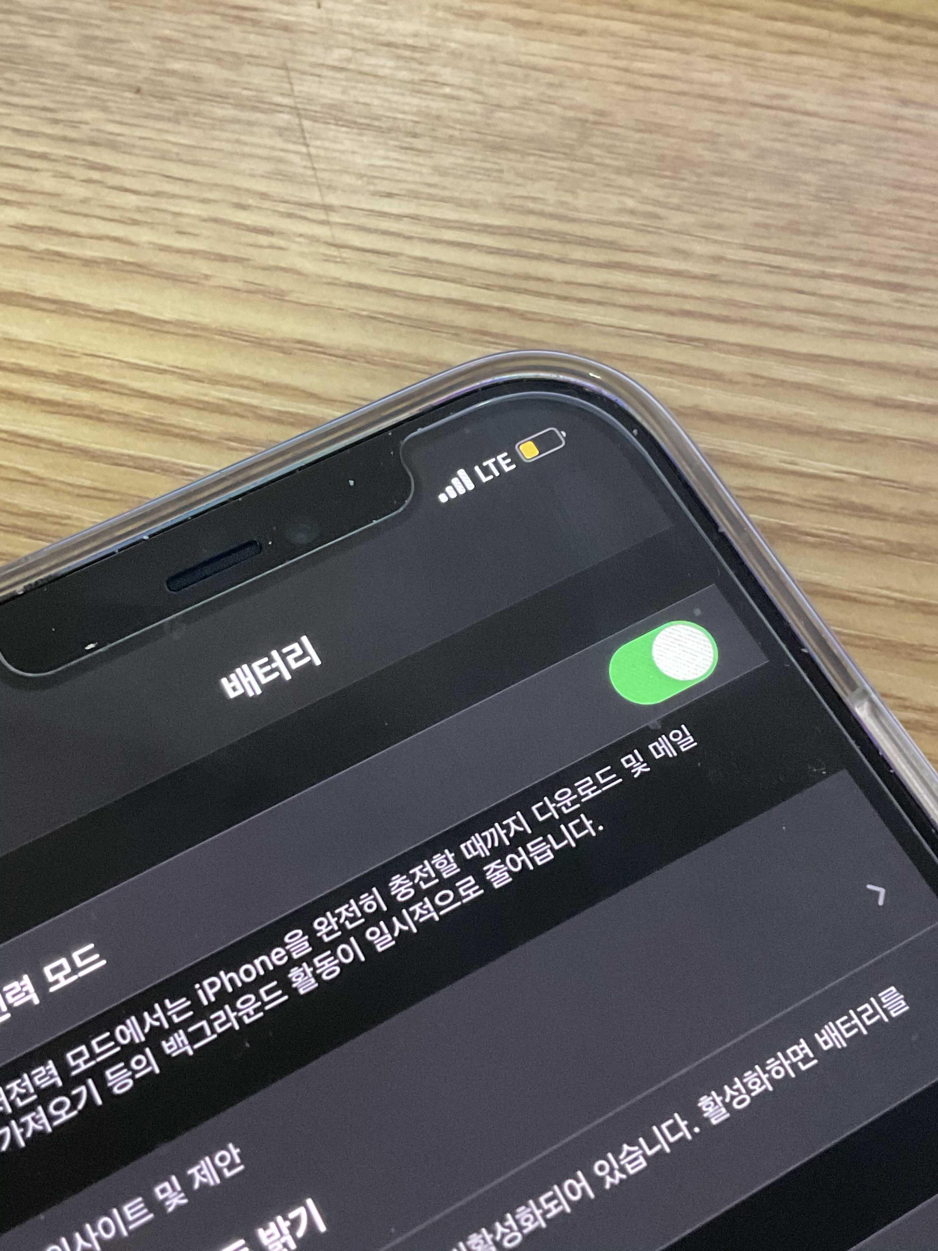 이렇게 아이폰 배터리 성능 확인까지 해 보았는데요. 만약에 배터러가 너무 빨리 줄어드는 걸 막기 위해서는 저전력모드를 사용하는걸 추천 드립니다. 이 부분은 저희가 벌써 한번 본 부분이거든요! 이렇게 저전력 모드를 좌에서 우로 끄고 킬 수 있습니다.