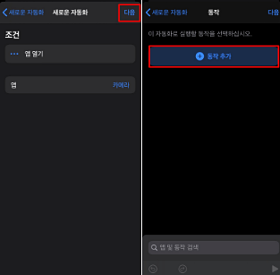 그러면 새로운 자동화 화면으로 다시 오게 되는데, 다음을 클릭 그리고 동작추가를 클릭 합니다.
