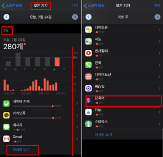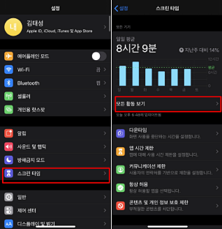 설정에서 스크린 타임 그리고 모든활동보기를 클릭 합니다.