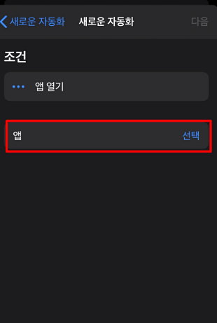 그러면 새로운 자동화->앱열기를 클릭 하면 앱 선택이라고 보이십니다. 앱 선택을 클릭 합니다.