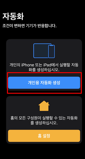 자동화를 클릭 하게 되면 제일 상단에 개인용 자동화 생성이라고 보입니다. 개인의 아이폰 또는 아이패드에서 실행할 자동화를 생성해야 하는데, 개인용 자동화 생성을 클릭 합니다.