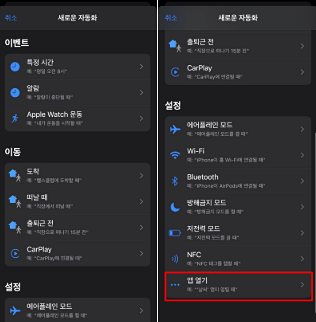 그러면 이벤트 부터 이동 설정 까지 다양한 카테고리가 있다는걸 확인 할 수 있는데요. 맨 밑에 앱 열기라고 보이시나요? 앱 열기를 클릭 합니다.