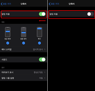 단축어로 들어가면 알림 허용이 있는데요! 이것을 꺼주면 깔끔하게 끝이 납니다.