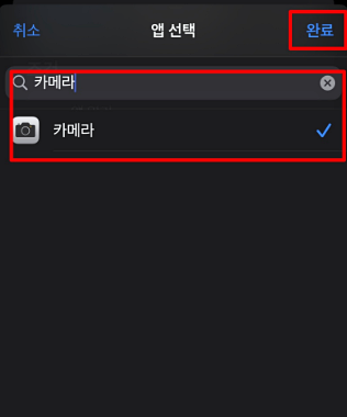 앱 선택에 저희가 필요한 앱을 검색해야 합니다. 카메라라고 검색을 하면 밑에 이렇게 카메라가 보이십니다. 체크 하고 완료를 합니다.