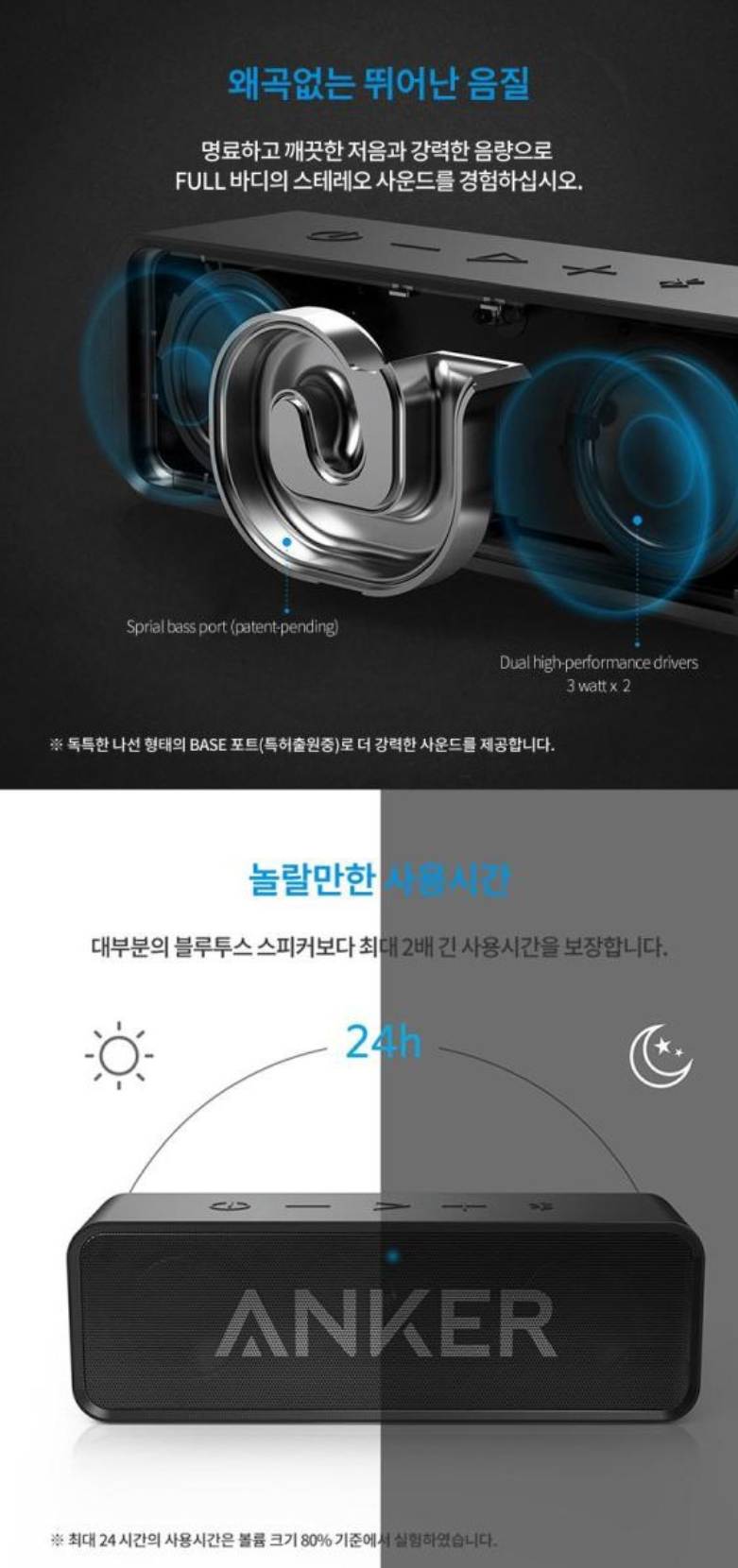 특히나 왜곡없는 뛰어난 음질이 앤커 사운드코어 블루투스 스피커가 유명한 이유중 하나인데요. 명료하고 깨끗한 저음 그리고 강력한 음량으로 풀 사운드를 경험할 수 있습니다.