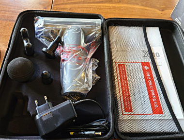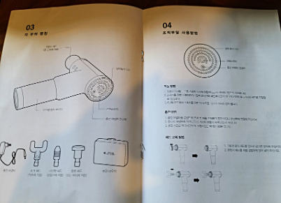 가방안 내용물을 보시죠.마사지건 본체, 헤드4개, 충전기, 메뉴얼 책자, 경고사항이 들어있습니다
