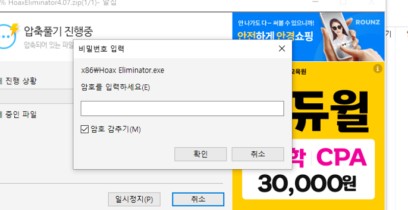 4) 압축을 풀기 시작하면, 바로 이렇게 암호입력을 해야합니다.