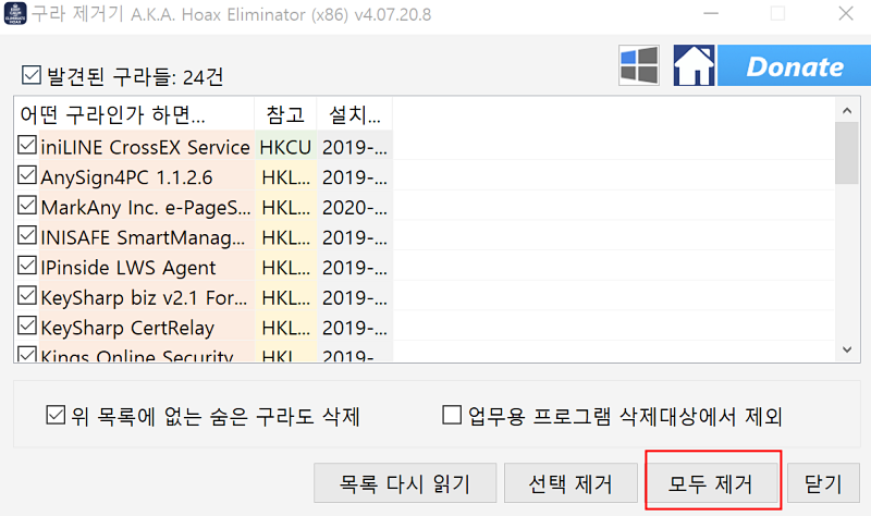 8) 하단 처럼 프로그램이 실행이 되죠? 저의 노트북에는 24건의 필요없는 프로그램들이 설치되어 있다는걸 확인 하실 수 있었어요~ 이것들이 노트북 느려짐 현상의 원인들!!! 모두 제거를 선택해 봅니다.